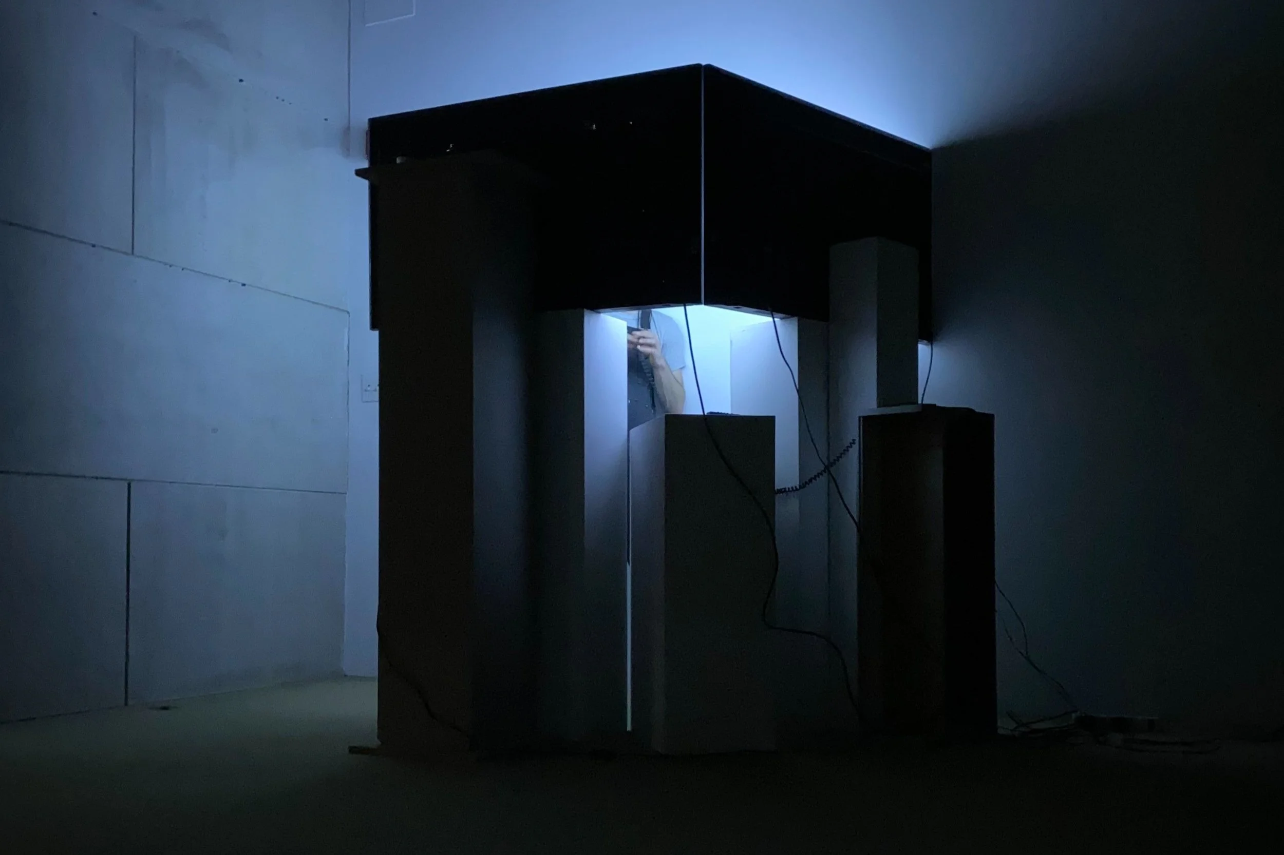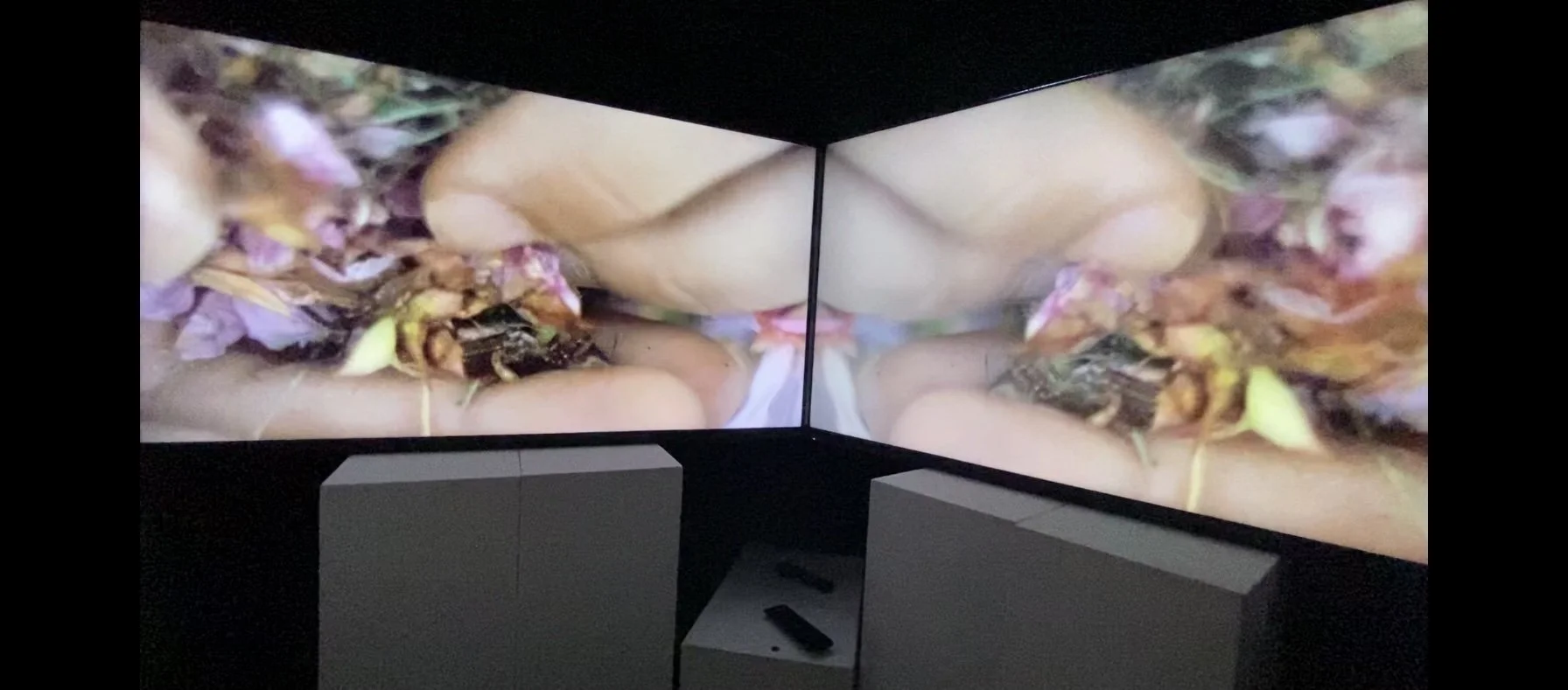 Intimately Removed (2021) is an immersive video installation about touch and intimacy. The viewer steps into an enclosed space, cornered by two large eye-level monitors playing mirrored extreme close-up footage, while they listen to the accompanying sounds on noise canceling headphones. The video is a montage of shots showing touch between natural elements (light, wind, water, fire), machines, nature, and humans. This installation creates an experience for the viewer that is overwhelmingly visceral, as they are visually and sonically experiencing touch. Yet, there exists a layer of alienation, since the viewer is alone and very removed from the content of the video. This paradox comments on existence and experience, and the growing human disassociation with both.